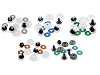 Félgömb szemek csillámos irisszel. A menetre felhelyezik az iriszt, következőleg áthúzzák az anyagot és a másik oldalán pedig felhelyezik a féket. 1 készlet = 1 szem + 1 csillámos irisz + 1 biztosíték
