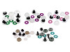Félgömb szemek csillámos irisszel. A menetre felhelyezik az iriszt, következőleg áthúzzák az anyagot és a másik oldalán pedig felhelyezik a féket. 1 készlet = 1 szem + 1 csillámos irisz + 1 biztosíték